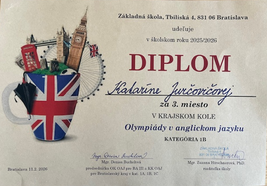 Naša šikovná žiačka Katka Jurčovičová z 9.A sa v krajskom kole Olympiády v anglickom jazyku umiestnila na skvelom 3. mieste.