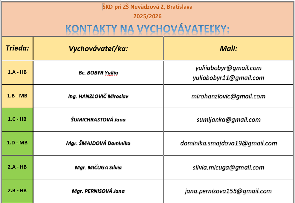 ŠKD pri ZŠ Nevädzová 2, Bratislava 2025/2026 PRACOVNÉ TANDEMY: | ||